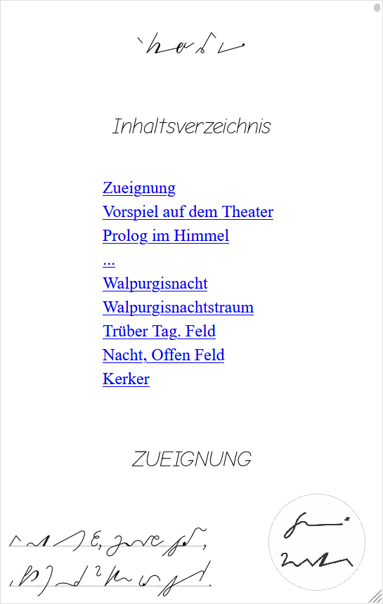 &&am &&lg=0 &&ll=0 Der Tragödie erster Teil {{Inhaltsverzeichnis}} &&gv &&g0="Zueignung" {{ZUEIGNUNG}} &&al &&lg=x Ihr naht euch wieder, schwankende Gestalten, Die früh sich einst dem trüben Blick gezeigt. ...